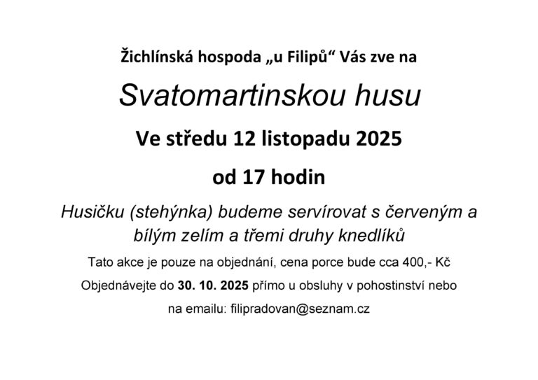 Žichlínská hospoda „u Filipů“ Vás srdečně zve na Svatomartinskou husu …